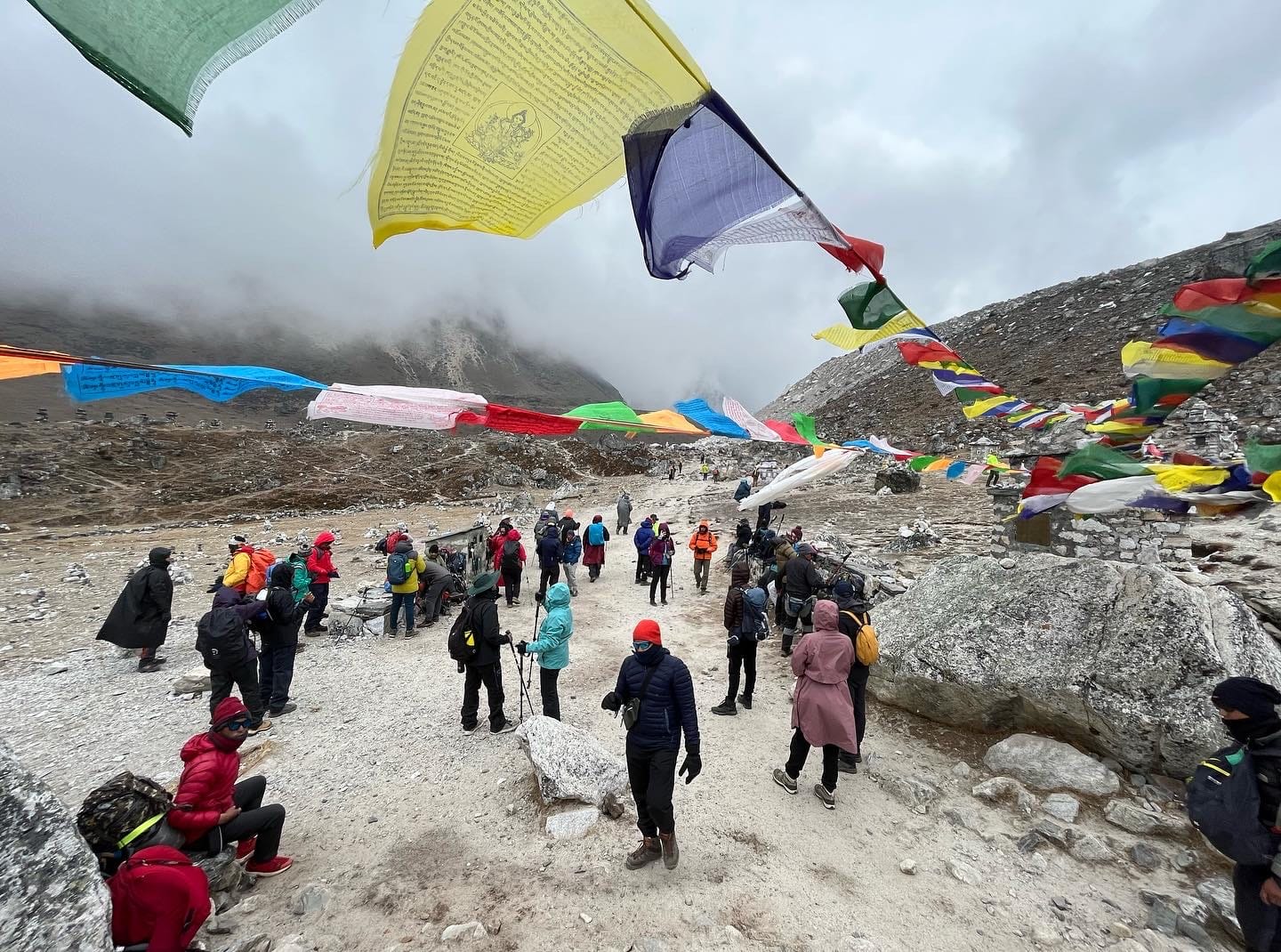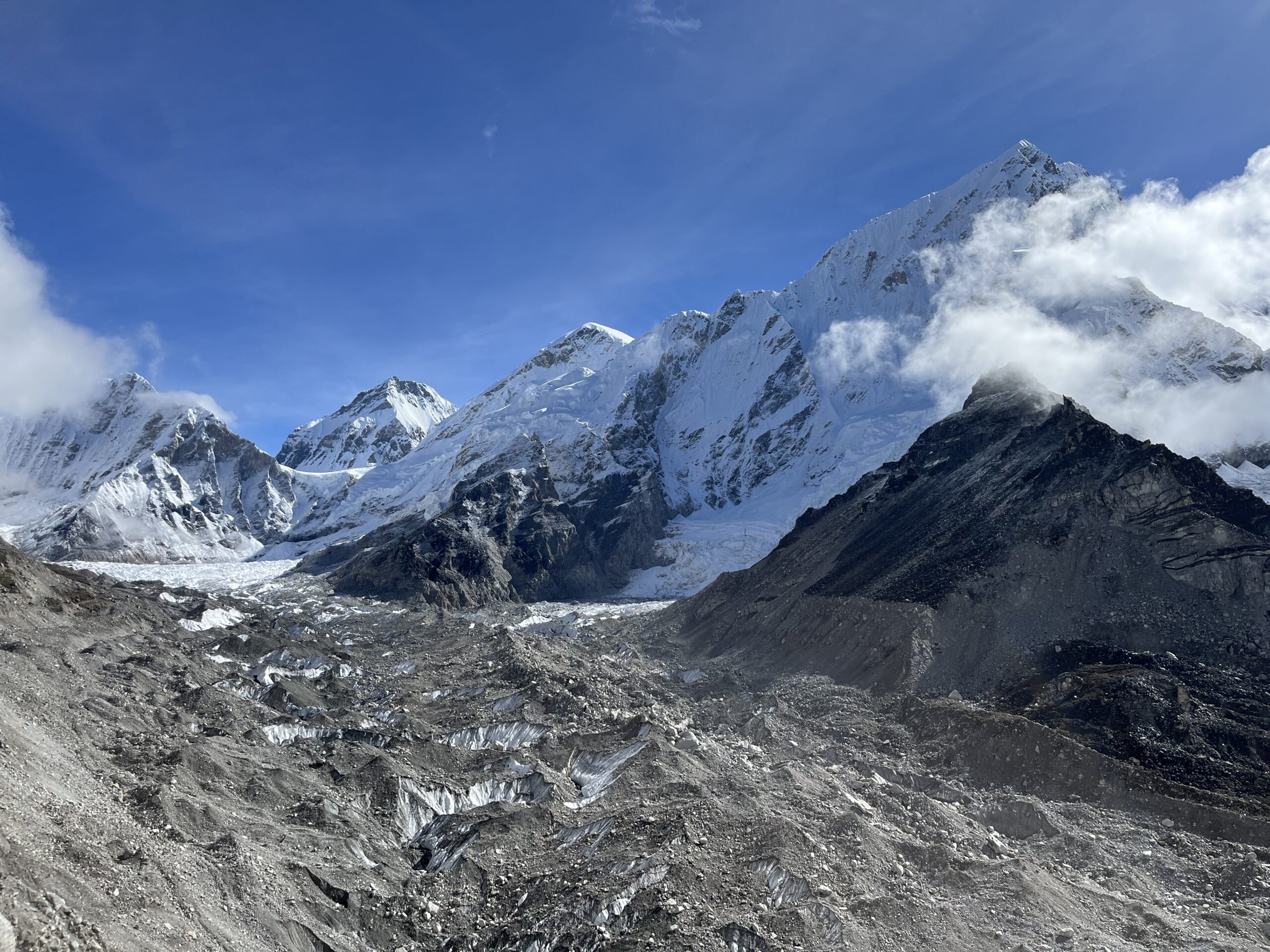 After a brief rest and early lunch at Gorakshep — the last outpost before Base Camp — we begin our final push. The path is filled with loose rocks and ice rubble but opens up to stunning close-ups of the Khumbu Icefall, Nuptse, and sometimes even climbers preparing their summit bids.